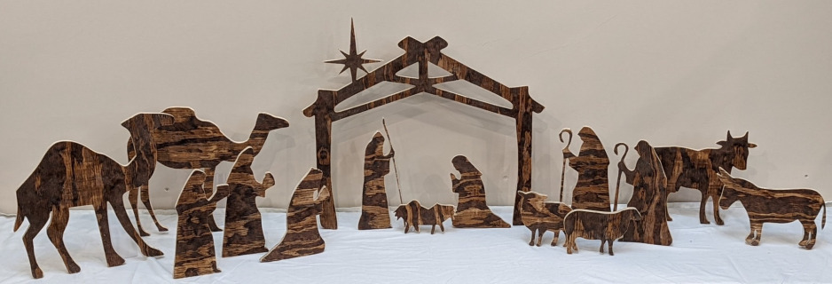 This custom made nativity scene can be the centerpiece of your Christmas decor. This is a large nativity scene - the stable is over 18 inches tall and is over 5 feet wide as pictured. This product can be ordered with a variety of finishes and can be scaled to your needs.